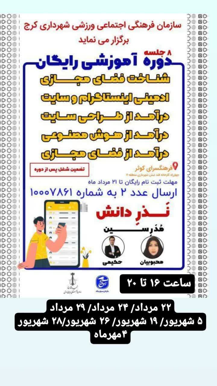 به گزارش دیده بان البرز، سید محمدرضا موسوی زاده، رئیس سازمان بسیج رسانه استان البرز از برگزاری دوره آموزشی رایگان شناخت فضای مجازی، ادمینی اینستاگرام و سایت، درآمد از طراحی سایت، هوش مصنوعی و فضای مجازی خبر داد و گفت: این دوره ها با مشارکت سازمان فرهنگی، ورزشی و اجتماعی شهرداری کرج و سازمان بسیج رسانه استان البرز برگزار می شود.
