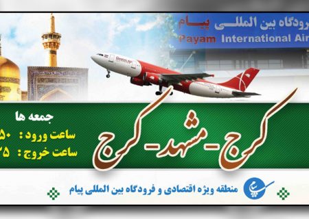 مدير عامل منطقه ويژه اقتصادی و فرودگاه بين المللی پيام با اشاره به برقراری پرواز از مبدا اين فرودگاه به مقصد مشهد مقدس و بالعكس اعلام كرد: پرواز در روزهای جمعه هر هفته انجام خواهد شد.