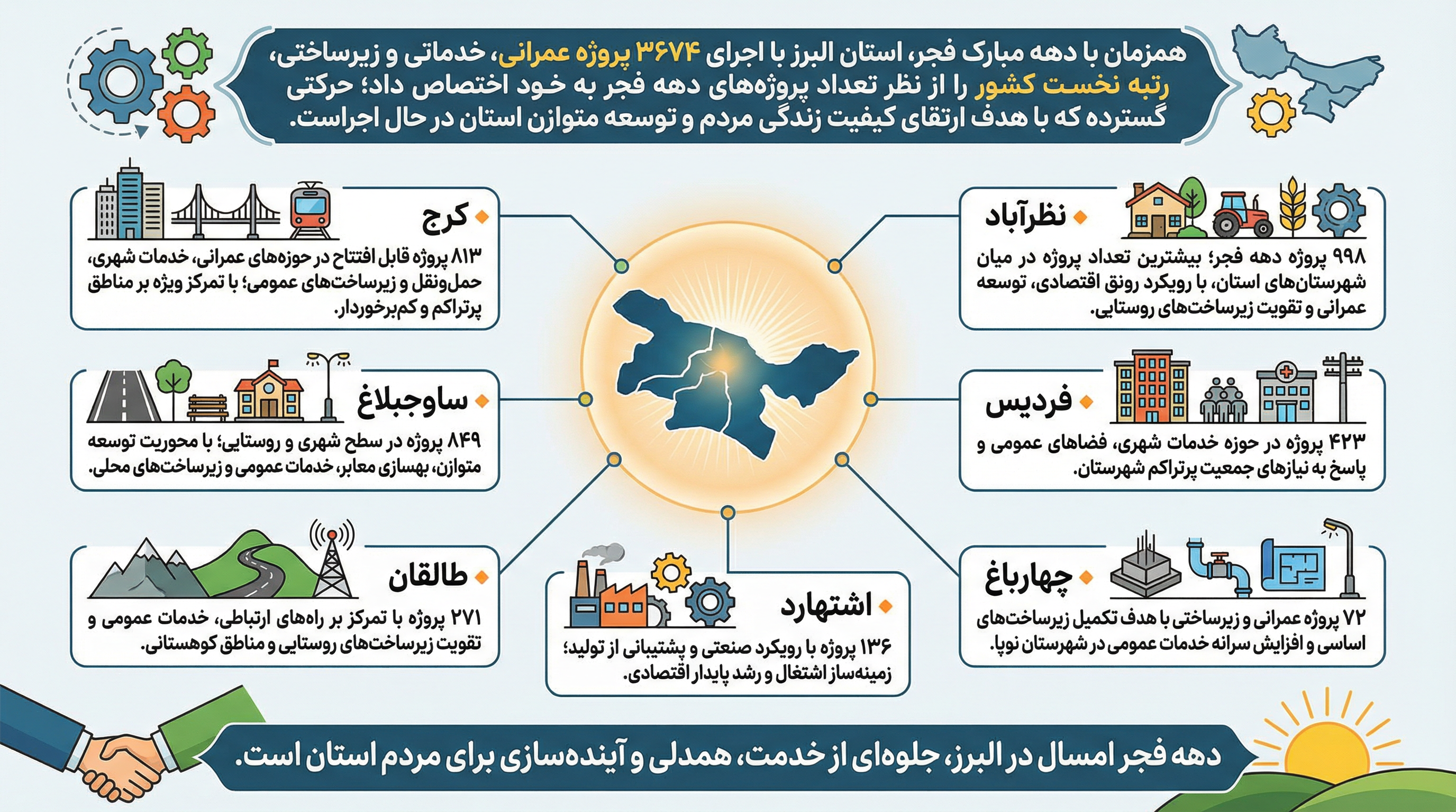 در شهرستان نظرآباد، ۹۹۸ پروژه دهه فجر به ثبت رسیده که این شهرستان را در صدر بیشترین تعداد پروژههای اجرایی استان قرار داده است. این طرحها با رویکرد رونق اقتصادی، توسعه عمرانی و تقویت زیرساختهای روستایی اجرا میشوند.